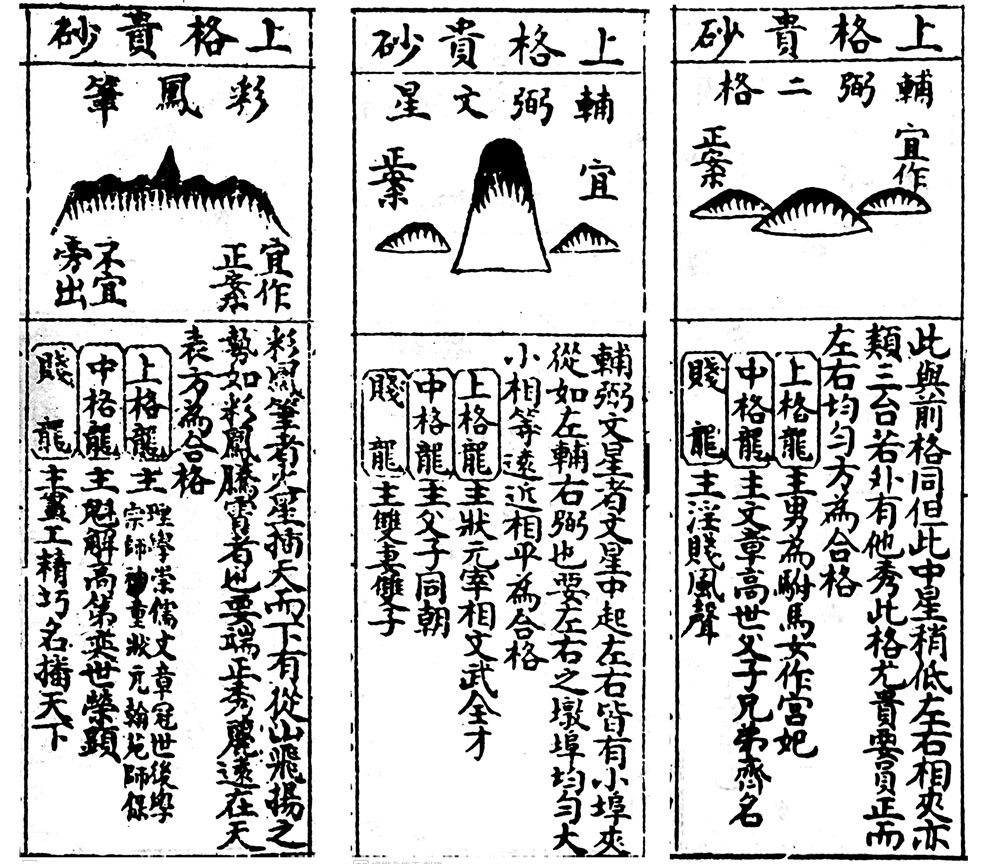 上格贵砂当中的彩凤笔(上图左1),是指最高而独尖形的山,左右展翅,火星插天而下,有从山飞扬之势如彩凤腾霄者也,端正秀丽远在天表。以凤凰为正朝,能收举世之气,主理学祟儒文章冠世后学宗师神童状元翰苑师保,魁解高第奕世荣显,低调形容为主启智,名扬天下,名利双收者也。